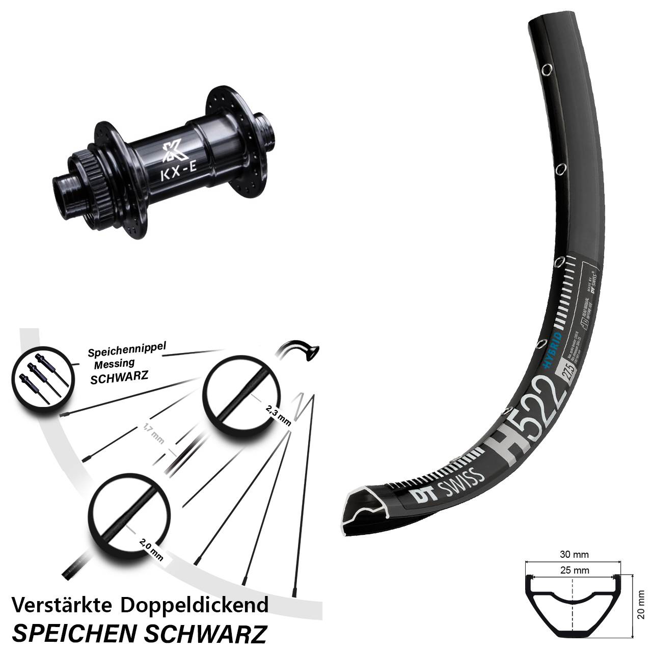 Technische Daten Vorderrad DT Swiss H 522 Disc schwarz mit Nabe KX-E verstärkt schwarz