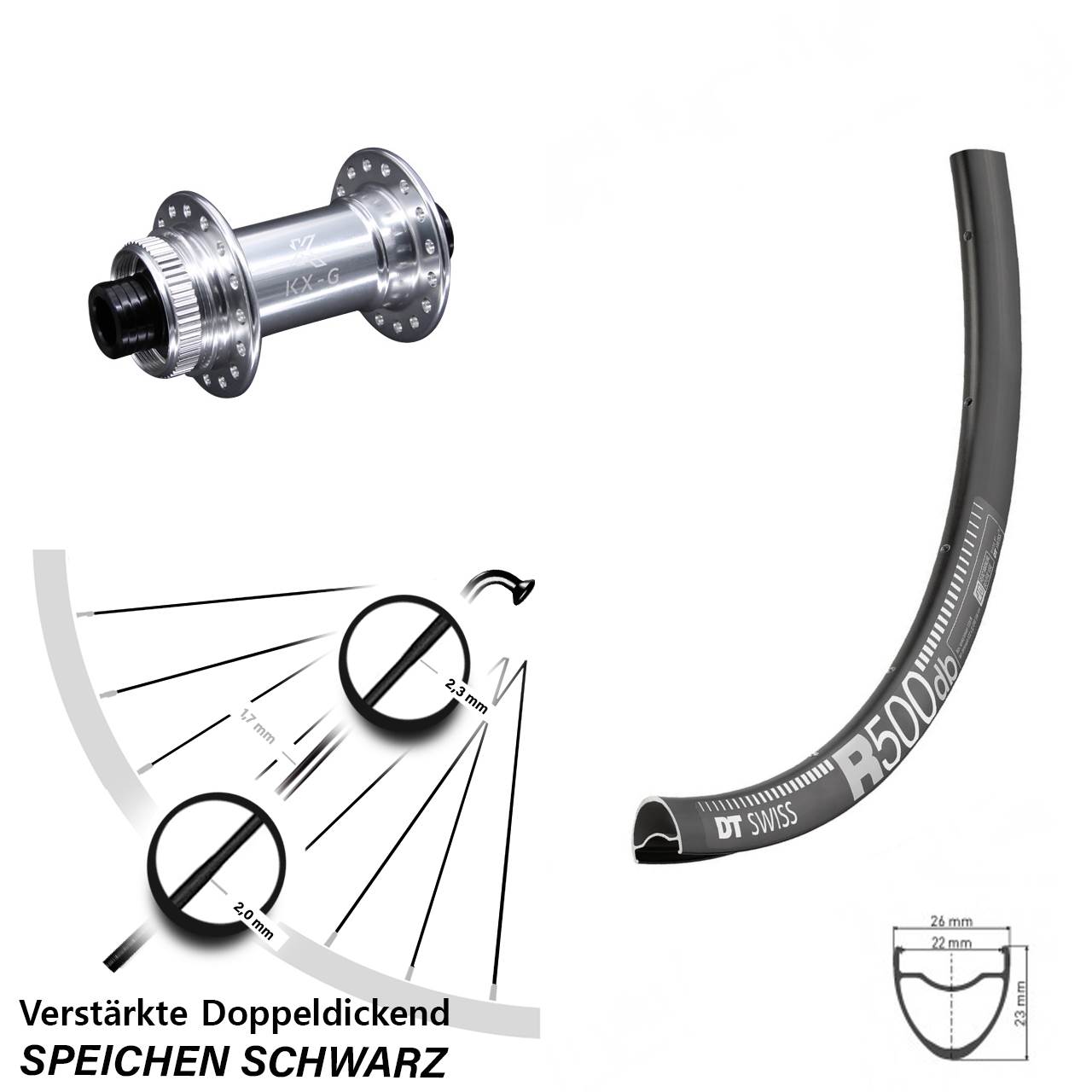 Technische Daten Vorderrad DT Swiss R500 schwarz mit Nabe KX-G silbern