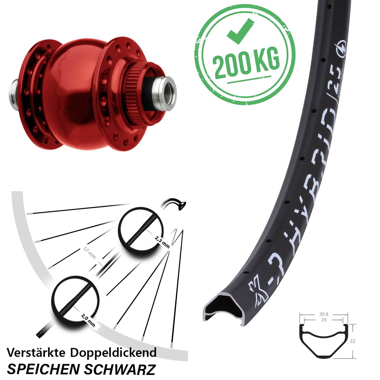 - Speichenstärke: 2,3-1,7-2,0 mm Edelstahl