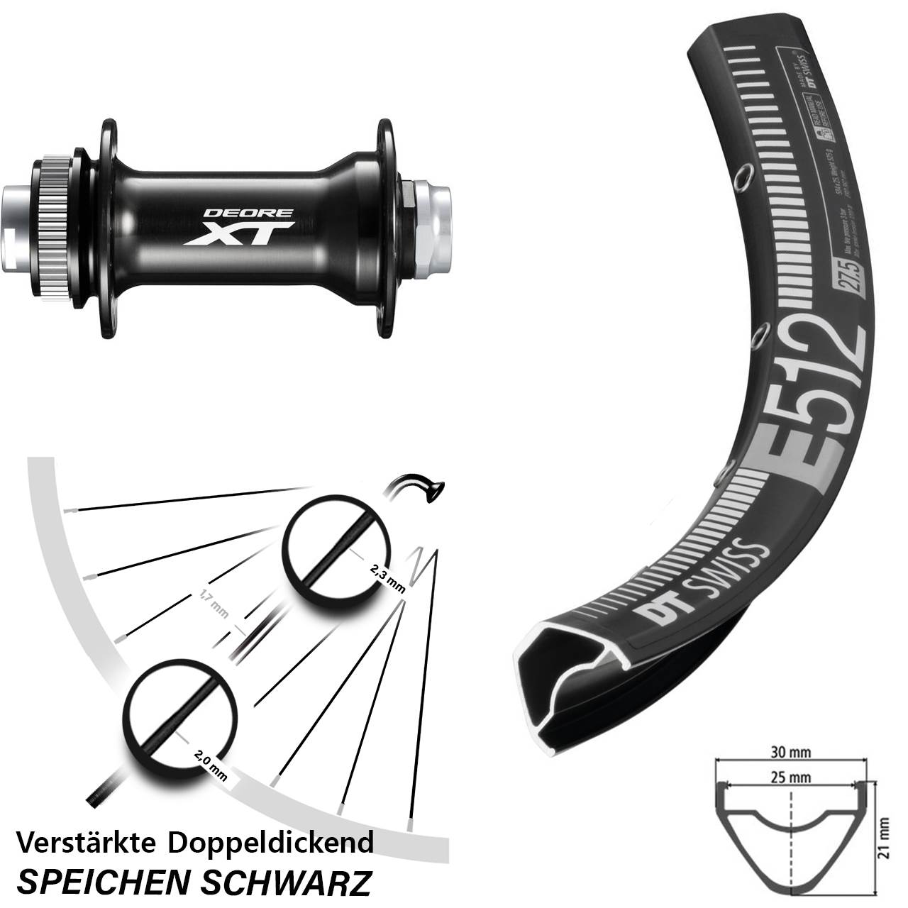 Technische Daten Vorderrad DT Swiss E 512 Disc schwarz mit Nabe Shimano HB-M8010-B schwarz