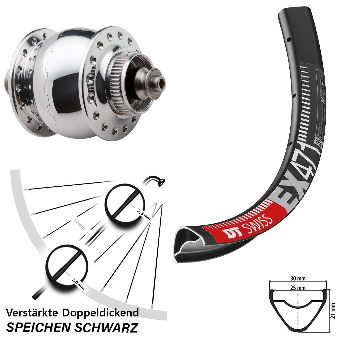 Technische Daten Vorderrad DT Swiss EX 471 Disc schwarz mit Nabendynamo SON delux silbern