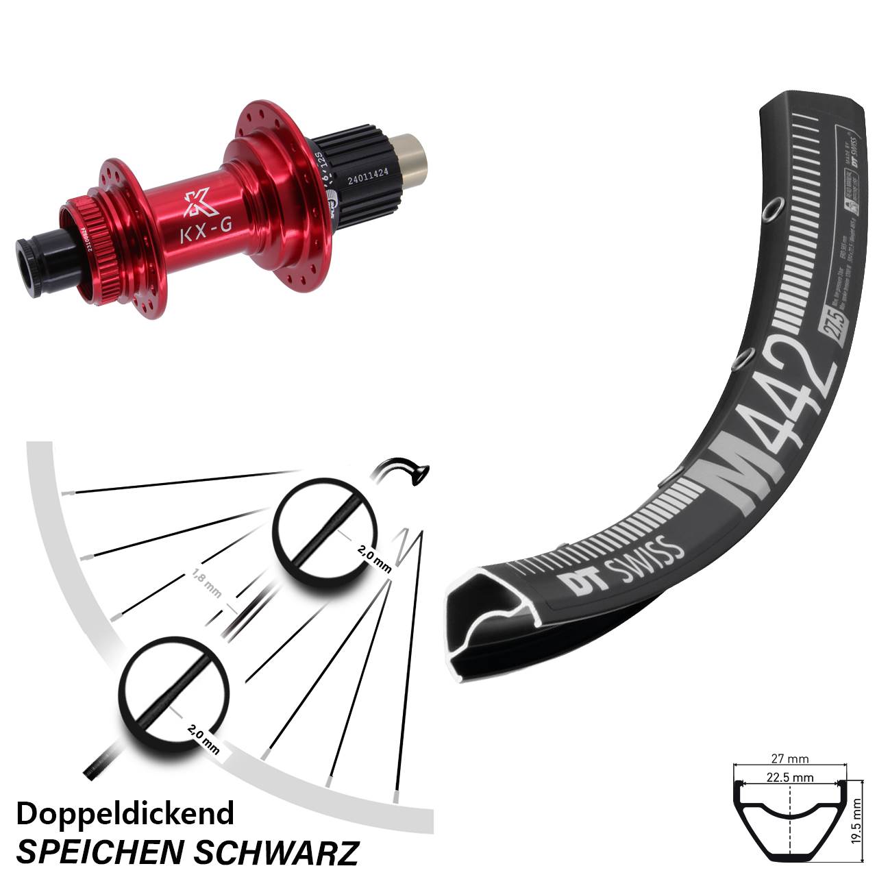 Technische Daten Hinterrad DT Swiss M 442 Disc schwarz mit Nabe KX-G Steckachse rot
