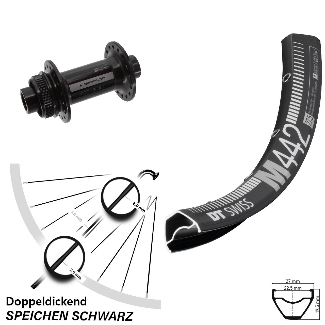 - Felge: Die schwarze DT Swiss M 442 Disc ist eine einfache und preiswerte Hohlkammer MTB-Felge mit einem guten Preisleistungsverhältnis für Einsteiger und Hobby-Fahrer. Das Modell DT Swiss M 442 Disc ist einfach geöst und die Felgenverbindung ist gepresst. Auf die Felge (Maulweite 23 mm, Höhe 19,5 mm, Breite 27 mm) können 35-57 mm breite Drahtreifen Faltreifen Tubeless Ready-Reifen aufgezogen werden. Sie ist ausschließlich für den Einsatz am Mountainbike / MTB Trekkingbike / Citybike vorgesehen. Die DT Swiss M 442 Disc Felge ist für Scheibenbremsen konzipiert. Mit bis zu 120 kg Systemgewicht ist diese Felge vom Schweizer Hersteller DT Swiss belastbar. Die DT Swiss M 442 Disc kann mit einem speziellen Felgenklebeband, speziellen Tubeless-Reifen und einem Tubeless Ventil auch ganz ohne einen Schlauch gefahren werden.