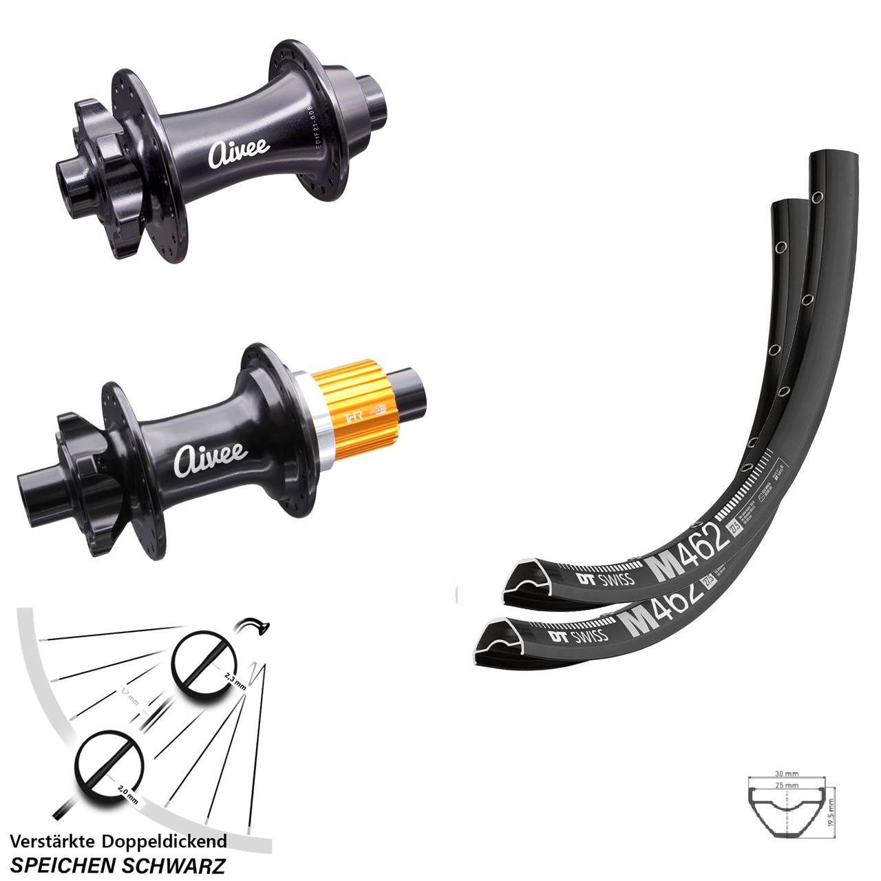 Dieser Laufradsatz mit den Achsmaßen von 15x110 12x148 in der Größe 29 Zoll ist aus diesen Einzelkomponenten gefertigt: schwarze Felgen DT Swiss M 462 Disc, Naben Aivee Classic Boost in der Farbe schwarz und 32 schwarze verstärkte Sapim E-Light Doppeldickendspeichen. Er ist bereits komplett eingespeicht und zentriert. Verwendet wird er an Mountainbike / MTB.