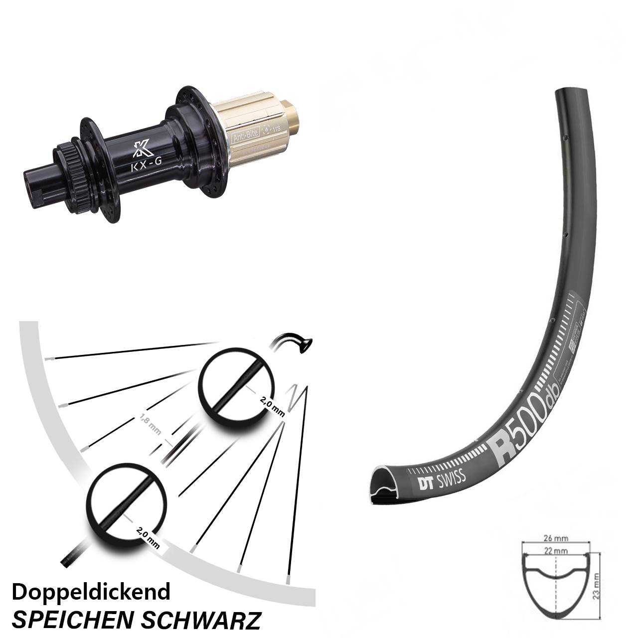 - Speichenstärke: 2,0-1,8-2,0 mm Edelstahl