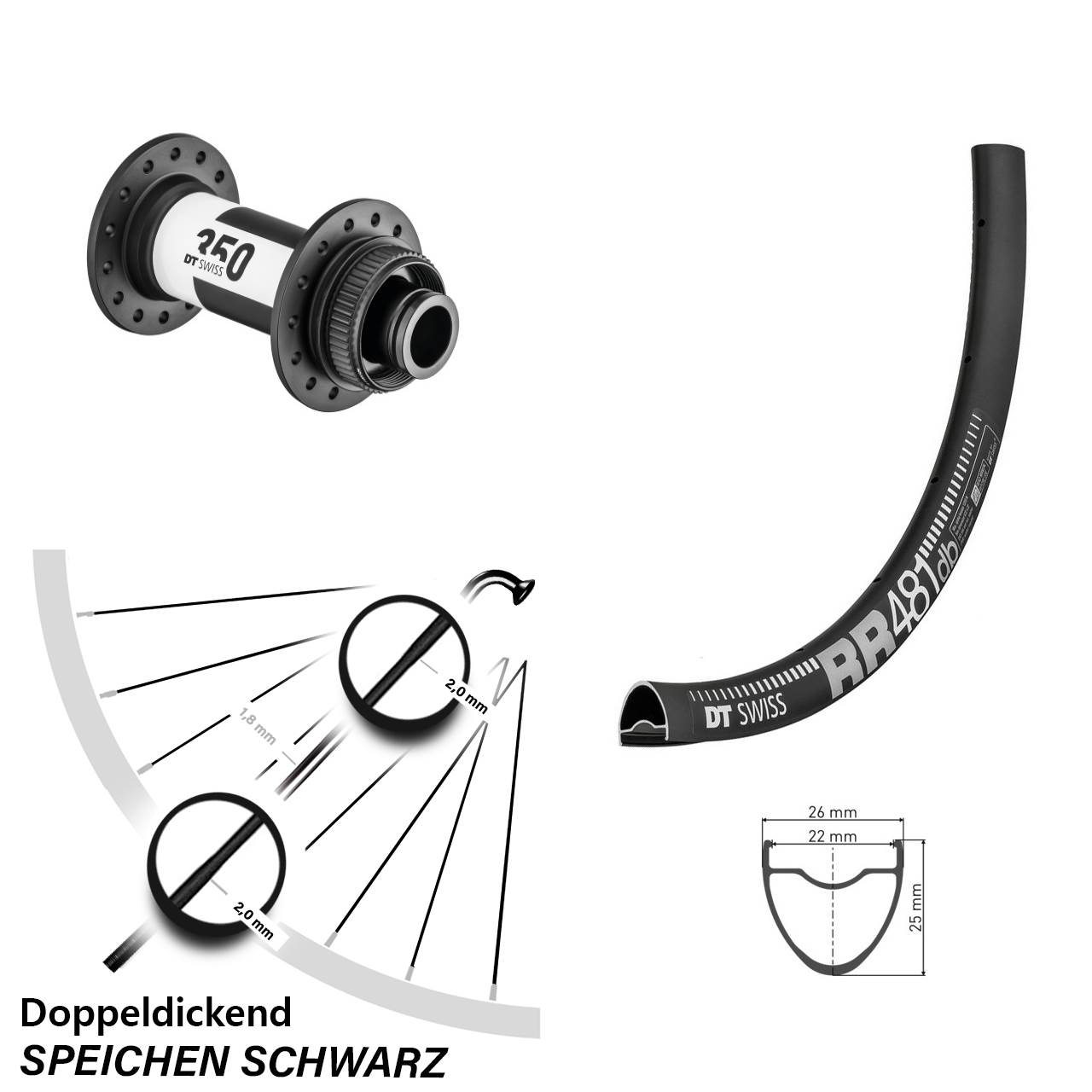 Technische Daten Vorderrad DT Swiss RR 481 Disc schwarz mit Nabe DT Swiss 350 schwarz