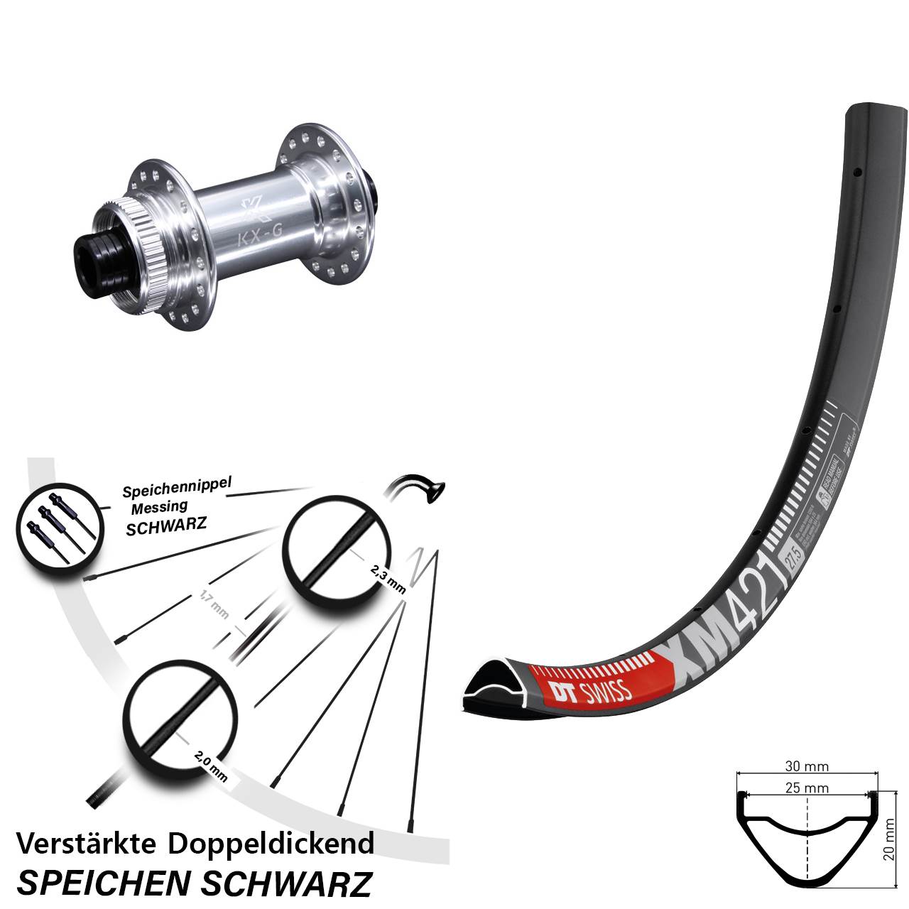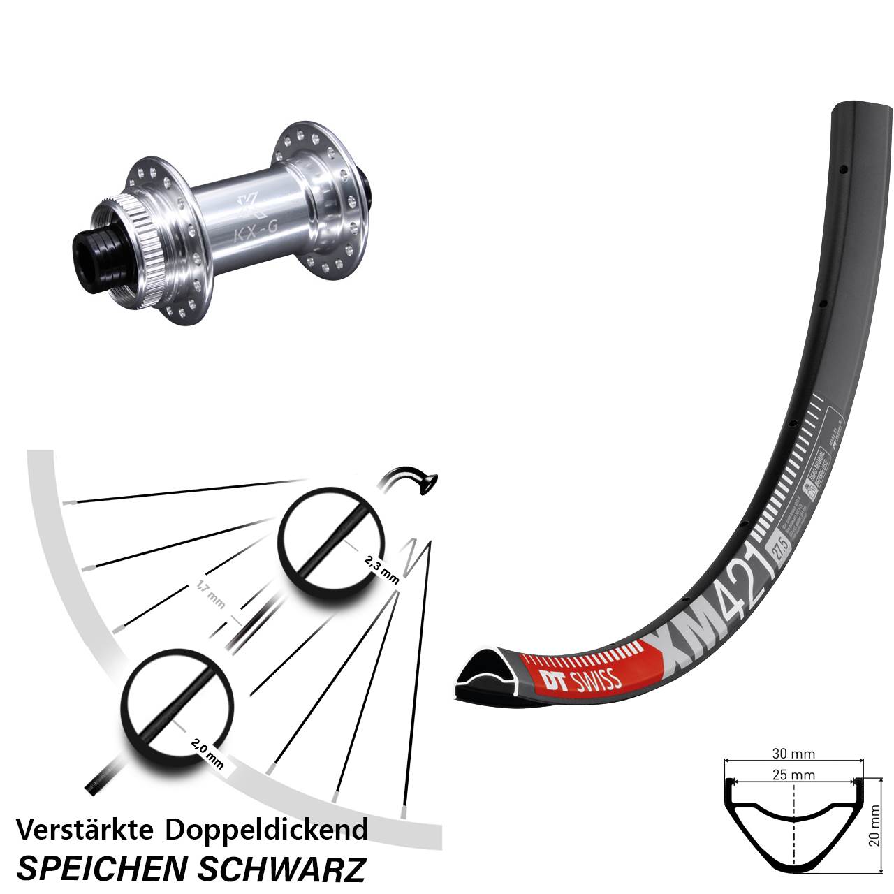Technische Daten Vorderrad DT Swiss XM 421 Disc schwarz mit Nabe KX-G silbern