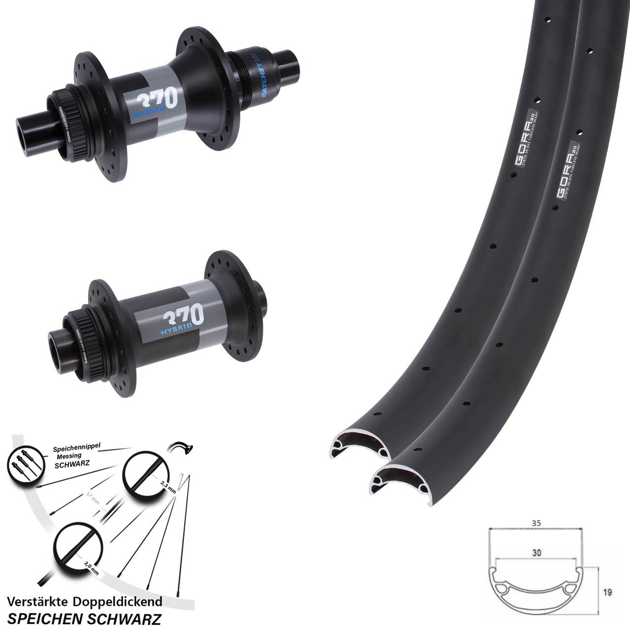 - 1 27,5 Zoll Gora 30 DT Swiss 370 Hybrid Centerlock Hinterrad 12x148 SRAM XD (Auswahl zwischen Messingnippel schwarz, Messingnippel silbern)
