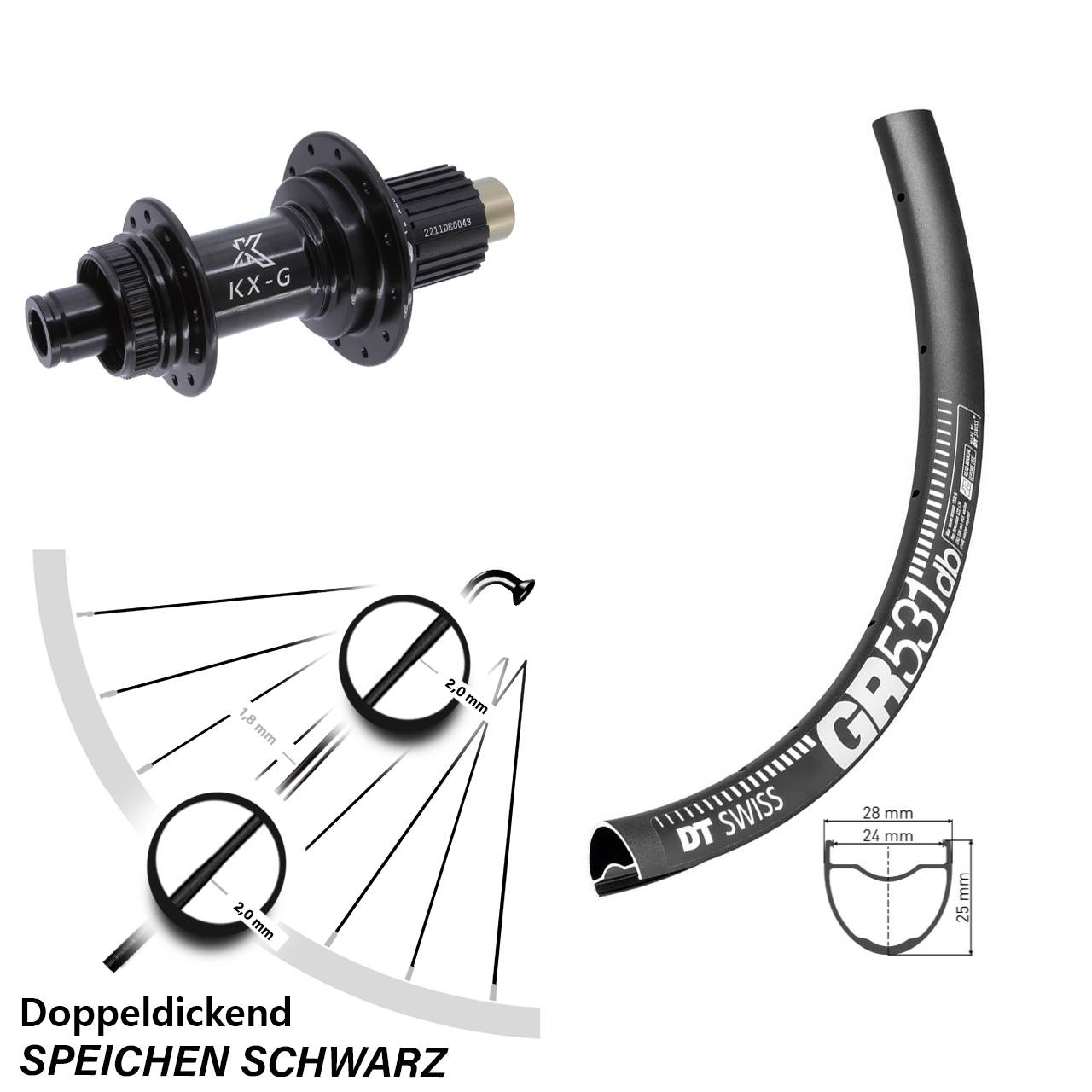 Technische Daten Hinterrad DT Swiss GR 531 Disc schwarz mit Nabe KX-G Steckachse schwarz