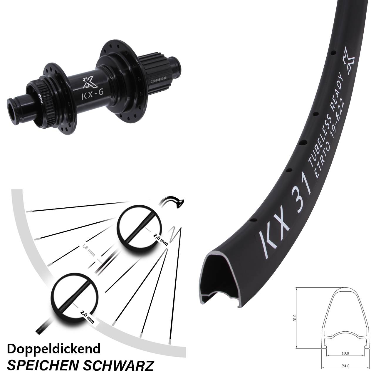 Technische Daten Hinterrad KX 31 schwarz mit Nabe KX-GS Stahlachse Stahl-Freilauf schwarz