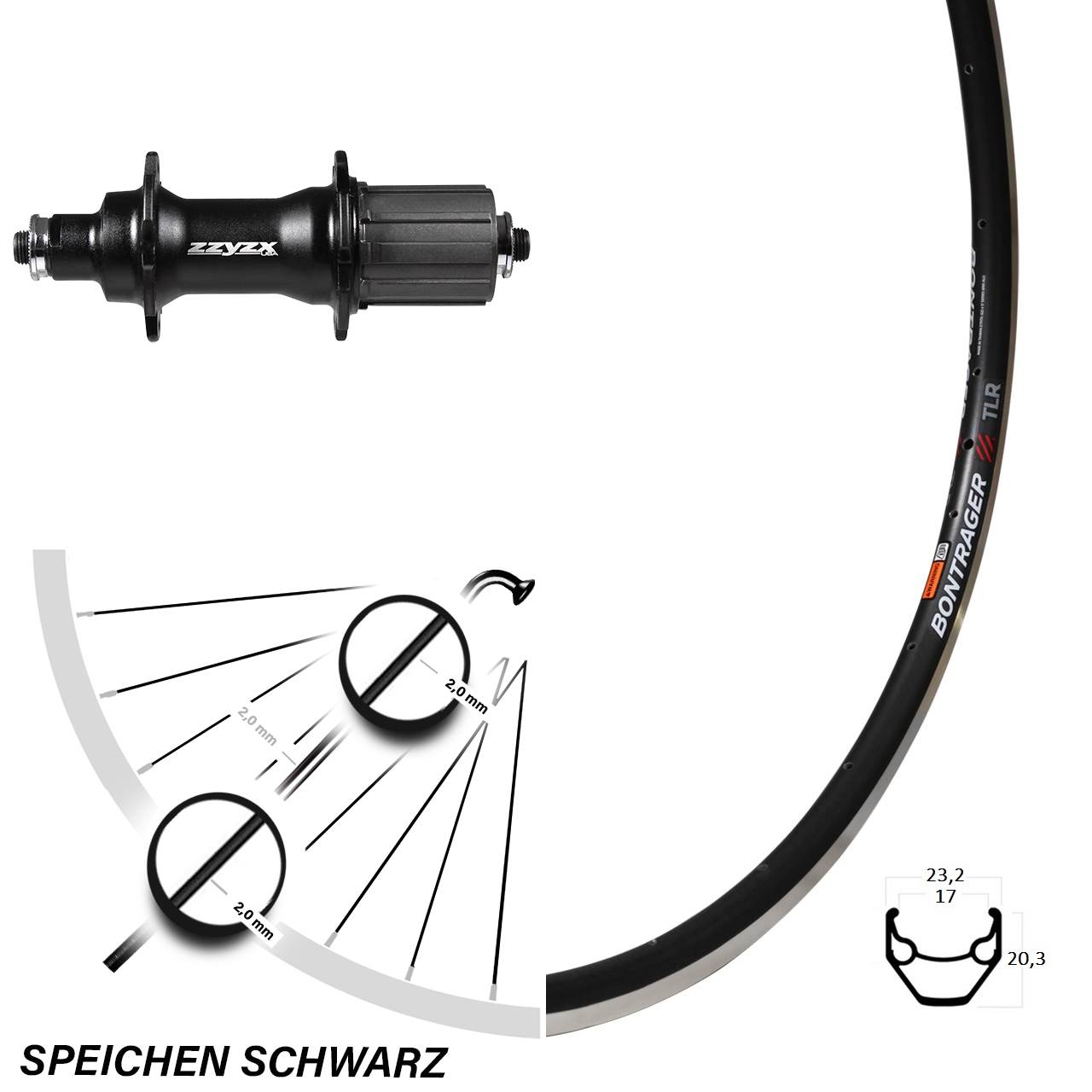 Technische Daten Hinterrad Bontrager TLR schwarz mit Nabe Formula ZZYZX HR TS 37A schwarz