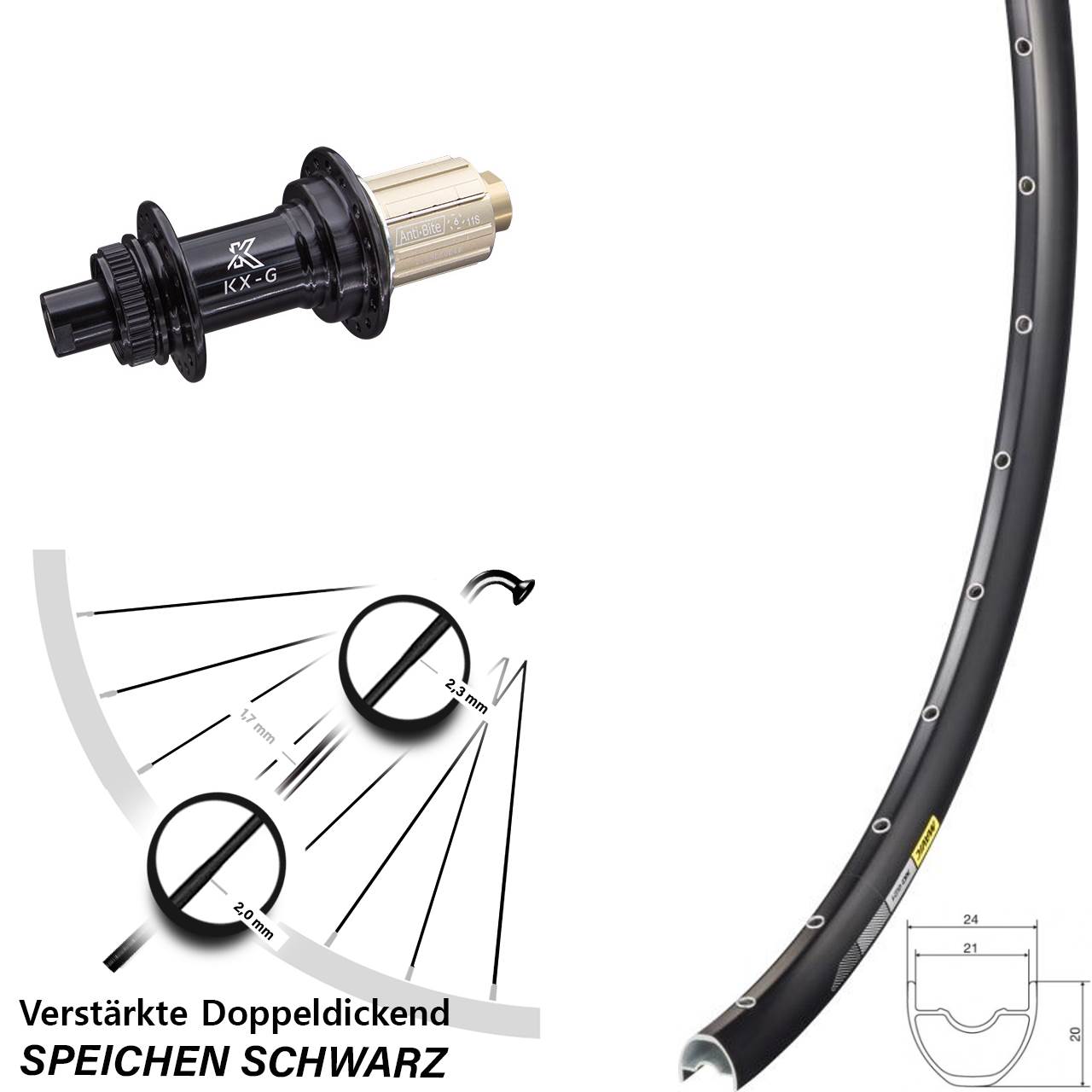 - Speichenstärke: 2,3-1,7-2,0 mm Edelstahl