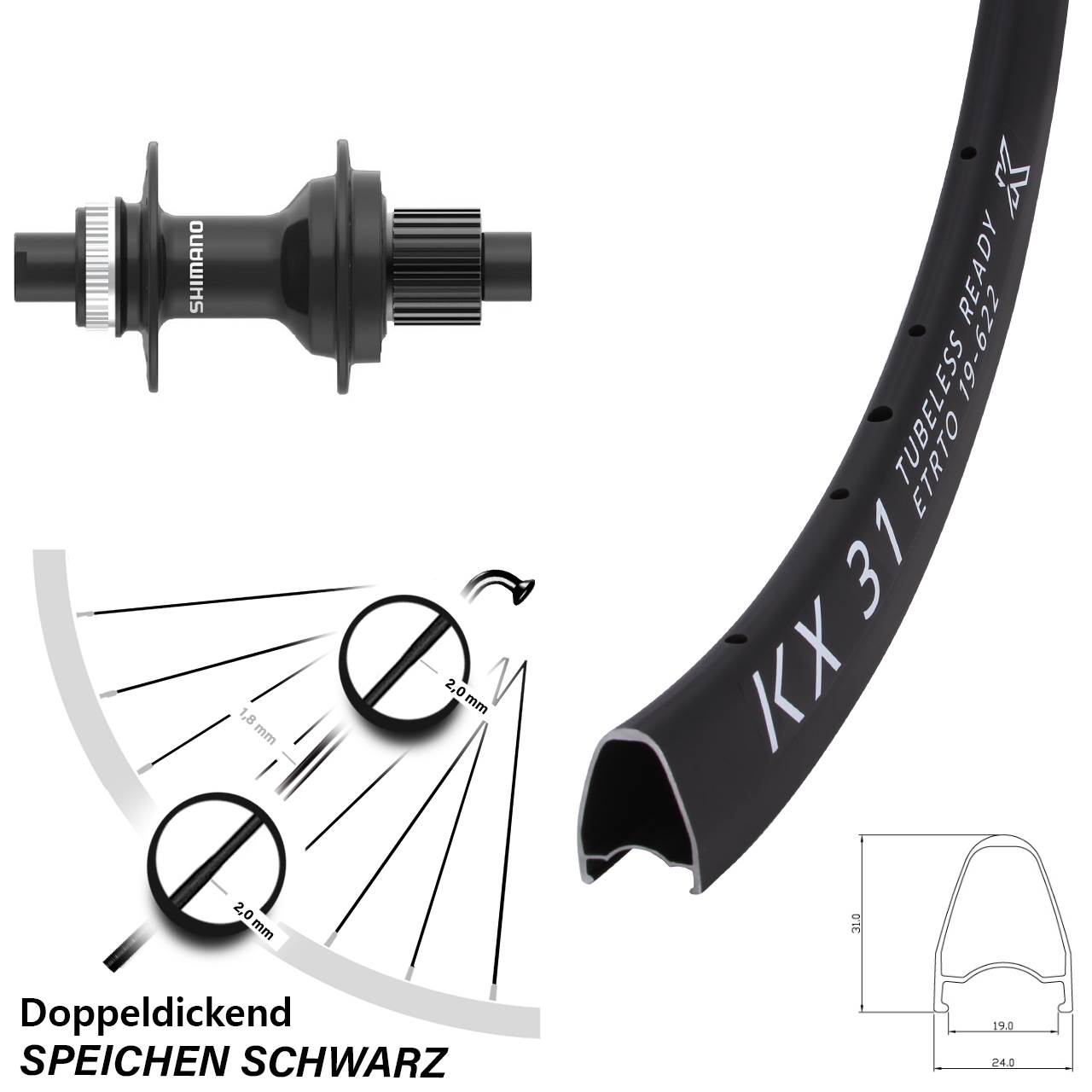 Technische Daten Hinterrad KX 31 schwarz mit Nabe Shimano FH-MT410 schwarz