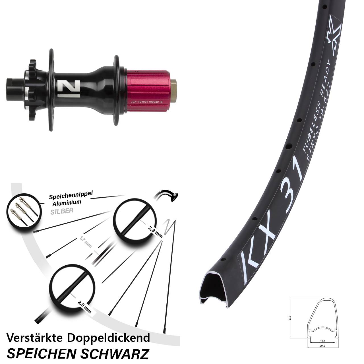- Speichenstärke: 2,3-1,7-2,0 mm Edelstahl