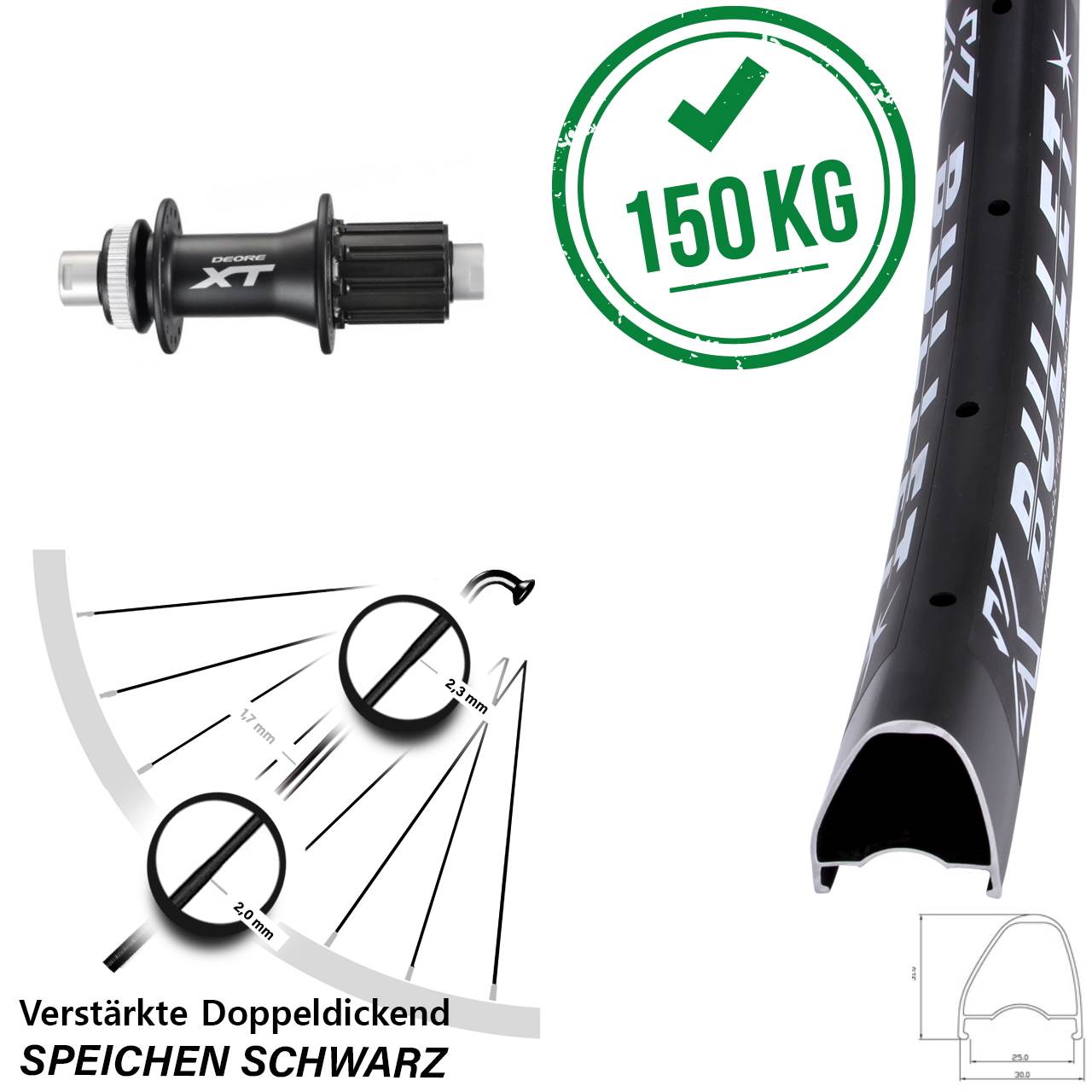 - zulässiges Systemgewicht: 150 kg mit Messingnippeln (120 kg mit Alunippeln) - extra stabiles Laufrad