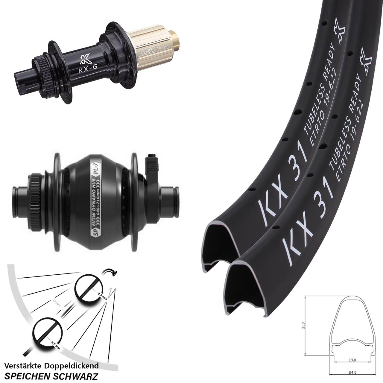 Diese KX-G Hinterradnabe mit einer Steckachse (12 mm) können Sie später problemlos mit einem entsprechenden Achsadapter auch auf eine 5/142 mm (Alumnium) oder 5/142 mm (Stahl) Aufnahme für Schnellspanner umrüsten. - Felgen: Dank unserer jahrzehntelangen Erfahrung im Laufradbau profitieren Sie von den Produkten aus unserer eigenen Entwicklung. Mit der Felge KX 31 Disc in der Farbe Schwarz haben wir von KX eine leichte, robuste und stabile Tubeless Ready Felge mit der ETRTO 19-622 auf dem Markt gebracht. Sie ist aus leichtem Aluminium gefertigt. Die saubere und hochwertige Verarbeitung der schwarzen KX 31 Disc Aluminium-Felge sorgt für eine sehr hohe Lebensdauer. Auf diese KX Fahrradfelge (Maulweite 19 mm, Felgenhöhe 31 mm, Felgenbreite 24 mm) können Reifen (Drahtreifen, Faltreifen, Tubeless Ready) mit einer Breite von 23-50 mm montiert werden. Diese leichte Felge sorgt mit den passenden Fahrradreifen für eine gute Beschleunigung mit bester Traktion. Das Modell 31 (Disc) verwendet Nippellöcher mit Unterlegscheiben für eine maximale Performance. Die Unterlegscheiben verbessern den Speichennippelsitz und stabilisieren so effektiv das Laufrad. Sie hat einen verstärkten Felgenboden und bietet ein stabiles Profil. Optimal also, wenn es mal etwas rauer zugeht, z.B. es mit dem Gravelbike auf die Schotterpiste, in den Wald oder auf die Trails geht. Die Felgenverbindung ist gepresst. Die KX 31 Disc ist für den Bereich Gravelbike und Rennrad vorgesehen. Sie ist recht leicht, ist jedoch sehr stabil ausgeführt und optimal für Gravelbikes geeignet, wo es oft zu hohen Belastungen kommt. Die KX 31 Disc Felge ist für Bikes mit Scheibenbremsen konzipiert. Mit bis zu 140 kg Systemgewicht ist die KX 31 Disc belastbar. Diese hohe Stabilität sorgt für eine gute Pannensicherheit. Kaufen können Sie die 31 Disc Felge als fertig eingespeichtes Laufrad (Vorderrad, Hinterrad und auch als kompletten Laufradsatz) vom Hersteller KX in unserem Laufrad-Online-Shop mit 28 Speichenlöchern. Mit KX Produkten aus unserer eigenen Entwicklung fahren Sie immer goldrichtig.