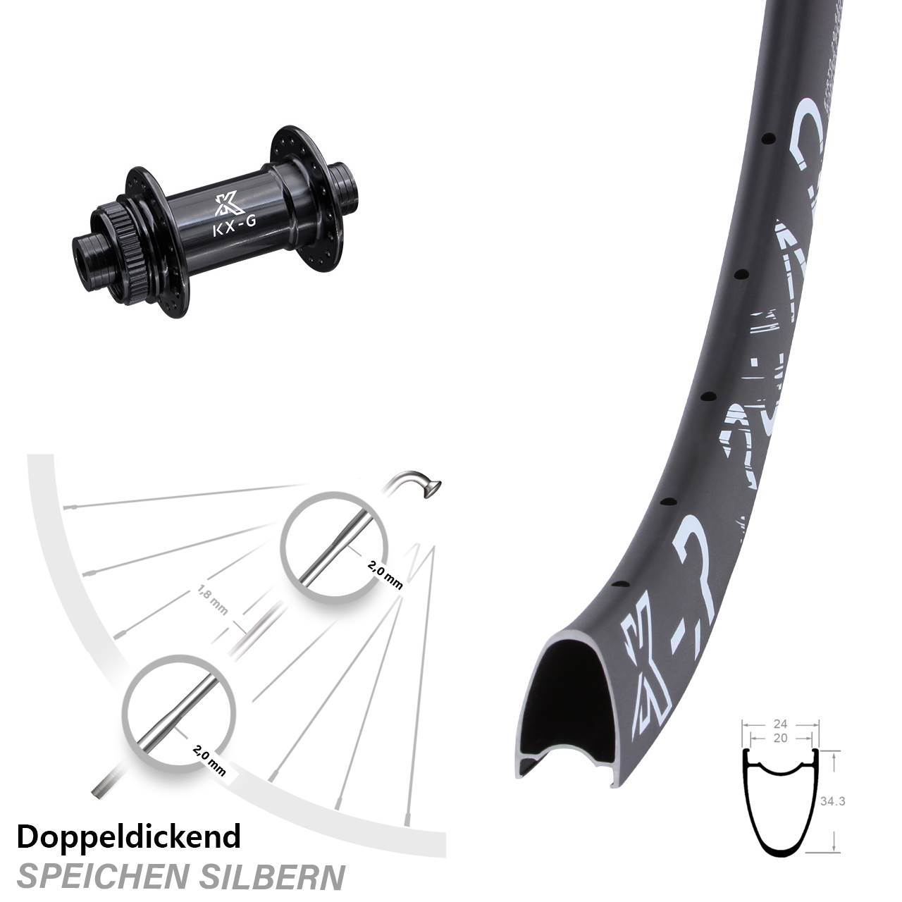 - Speichenstärke: 2,0-1,8-2,0 mm Edelstahl