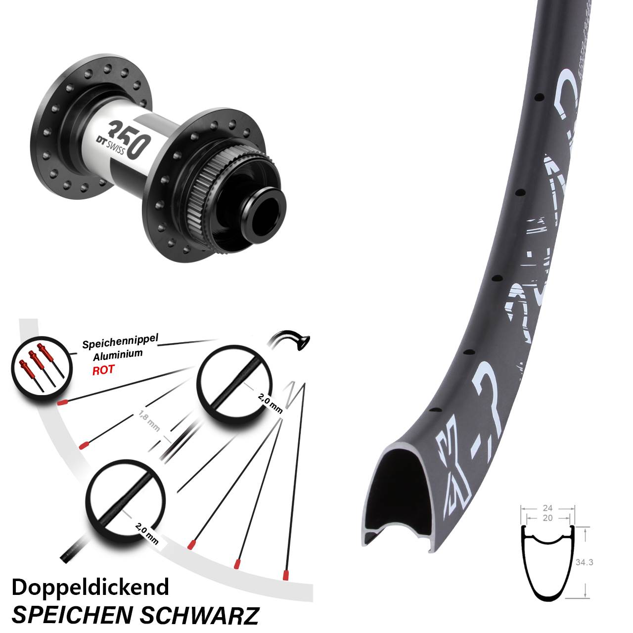 - Speichenstärke: 2,0-1,8-2,0 mm Edelstahl