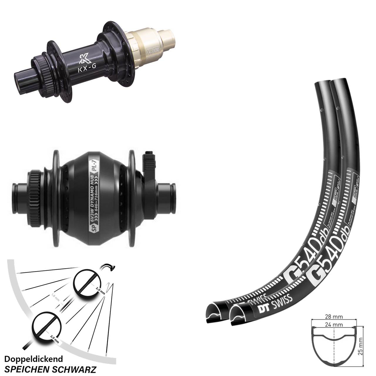 - 1 28 Zoll Vorderrad mit Nabendynamo DT Swiss G 540 Shutter Precision PL-7 (Auswahl zwischen Alunippel rot, Alunippel schwarz, Alunippel silbern, Messingnippel schwarz, Messingnippel silbern)