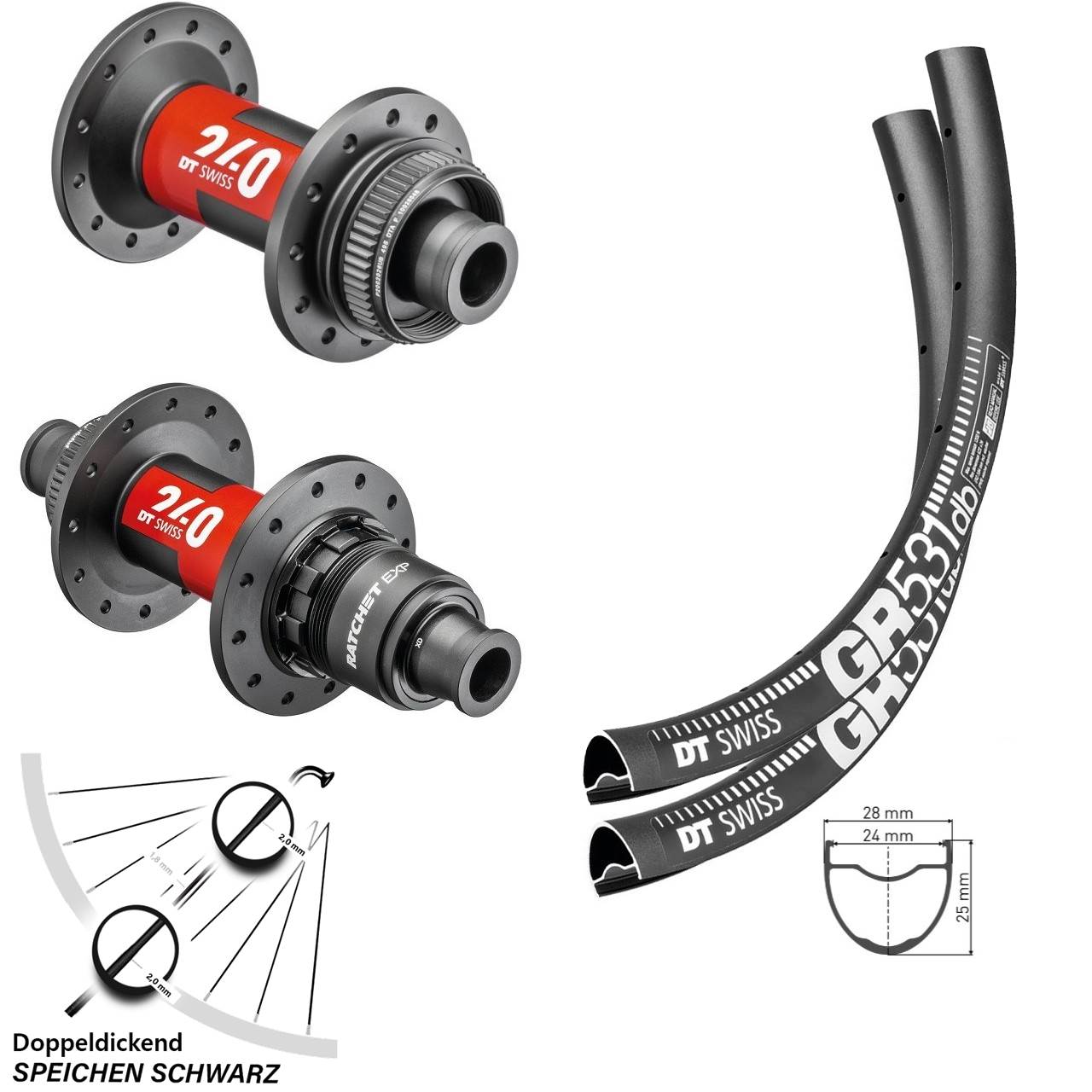 - Modell Vorderradnabe / Hinterradnabe: DT Swiss 240 Ratchet EXP DT Swiss 240 Road schwarz