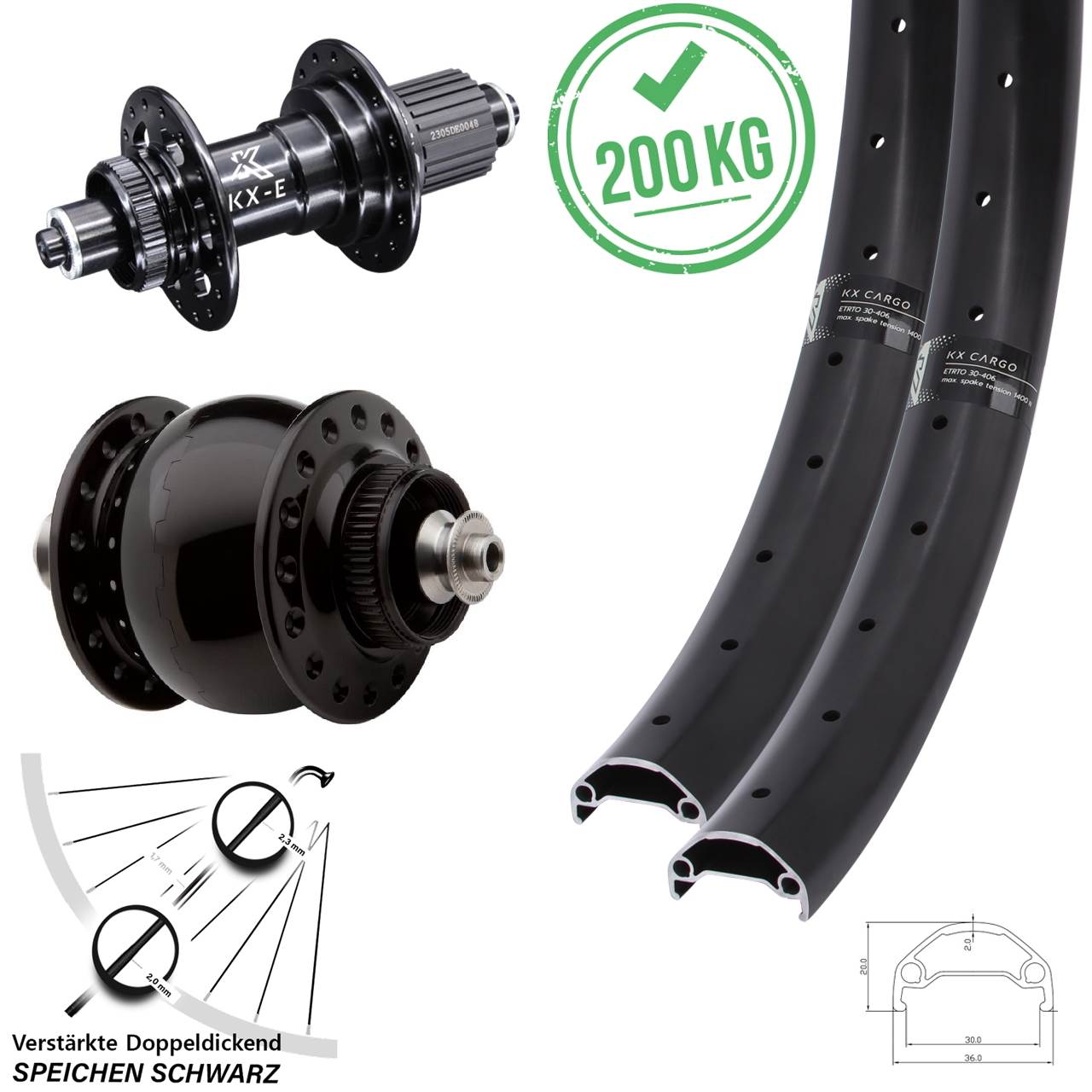Dieser zentrierte und komplett eingespeichte 20 Zoll 26 Zoll Laufradsatz mit den Achsmaßen von 5x100 (für Schnellspanner) 5x135 (für Schnellspanner) für Lastenrad besteht aus den schwarzen Felgen KX Cargo Schwerlast, den Naben KX-E SON 28 in der Farbe schwarz und 36 schwarzen verstärkten Sapim E-Light Doppeldickendspeichen.