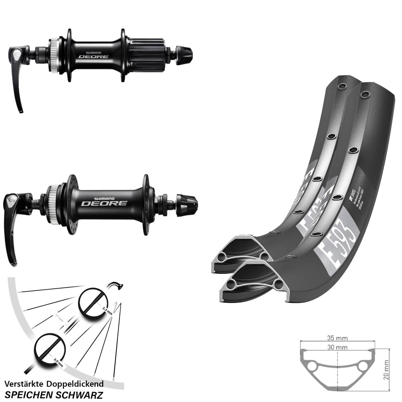 Dieser Laufradsatz in der Größe 29 Zoll mit den Achsmaßen von 5x100 (für Schnellspanner) 5x135 (für Schnellspanner) ist aus den folgenden Komponenten aufgebaut: schwarze Felgen DT Swiss E 593, Naben Shimano FH-M6000 Shimano HB-M6000 in der Farbe schwarz und 32 schwarze verstärkte Sapim E-Light Doppeldickendspeichen. Verwendet wird er an Mountainbike / MTB. Er ist komplett eingespeicht und zentriert.