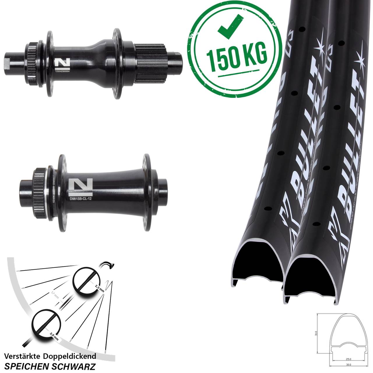 - Felgen: Dank unserer langjährigen Erfahrung im Laufradbau profitieren Sie von den Produkten aus unserer eigenen Entwicklung. Mit der Felge in der Farbe Schwarz haben wir von KX eine extra stabile und sehr robuste Tubeless Ready Felge mit der ETRTO 25-622 auf dem Markt gebracht. Sie ist aus Aluminium gefertigt. Die sehr saubere und hochwertige Verarbeitung der schwarzen Aluminium-Felge sorgt für eine sehr hohe Lebensdauer. Auf diese KX Felge (Maulweite 25 mm, Felgenhöhe 31 mm, Felgenbreite 30 mm) können Fahrradreifen (Drahtreifen, Faltreifen, Tubeless Ready) mit einer Breite von 30-65 mm montiert werden. Diese extra stabile Felge sorgt mit den passenden Fahrradreifen für eine gute Beschleunigung mit bester Traktion. Das Modell Bullet verwendet Nippellöcher mit Unterlegscheiben für eine maximale Performance. Die Unterlegscheiben verbessern den Speichennippelsitz und stabilisieren so effektiv das Laufrad. Sie hat einen verstärkten Felgenboden und bietet ein stabiles Profil. Optimal also, wenn es mal etwas rauer zugeht, es z.B. mit dem Gravelbike auf die Schotterpiste, in den Wald oder auf die Trails geht. Die Felgenverbindung ist gepresst. Die ist für den Einsatzzweck Bikepackingbikes, E-Gravelbikes und E-Gravelbikes vorgesehen. Sie fällt sehr breit und besonders stabil aus und ist perfekt für Gravelbikes und Bikepackingbikes geeignet, wo es oft zu hohen Belastungen kommt. Die Felge ist für Bikes mit Scheibenbremsen vorgesehen. Mit bis zu hohen 150 kg Systemgewicht ist die belastbar. Diese hohe Stabilität sorgt für eine gute Pannensicherheit. Kaufen können Sie die Bullet Felge als fertig eingespeichtes Laufrad (Vorderrad, Hinterrad und auch als kompletten Laufradsatz) vom Hersteller KX in unserem Laufrad-Online-Shop mit 32 Speichenlöchern. Mit KX Produkten aus unserer eigenen Entwicklung fahren Sie immer goldrichtig.