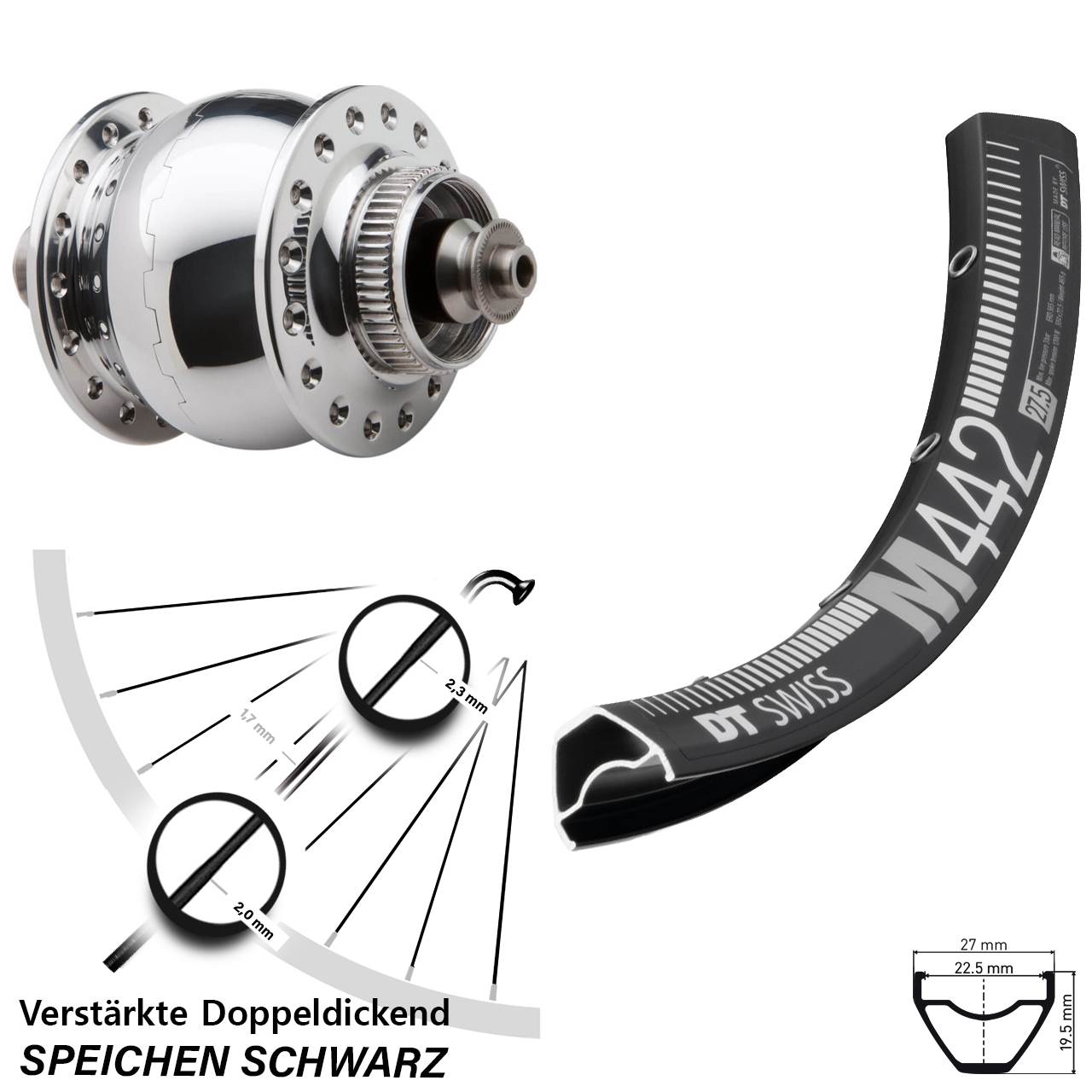 Technische Daten Vorderrad DT Swiss M 442 Disc schwarz mit Nabendynamo SON delux silbern