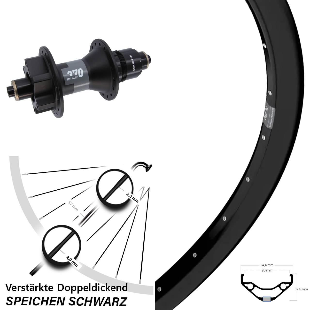 Ryde Disc 30 DT Swiss 370 27,5 Zoll Hinterrad QR Boost XD mit verstärkten Doppeldickendspeichen
