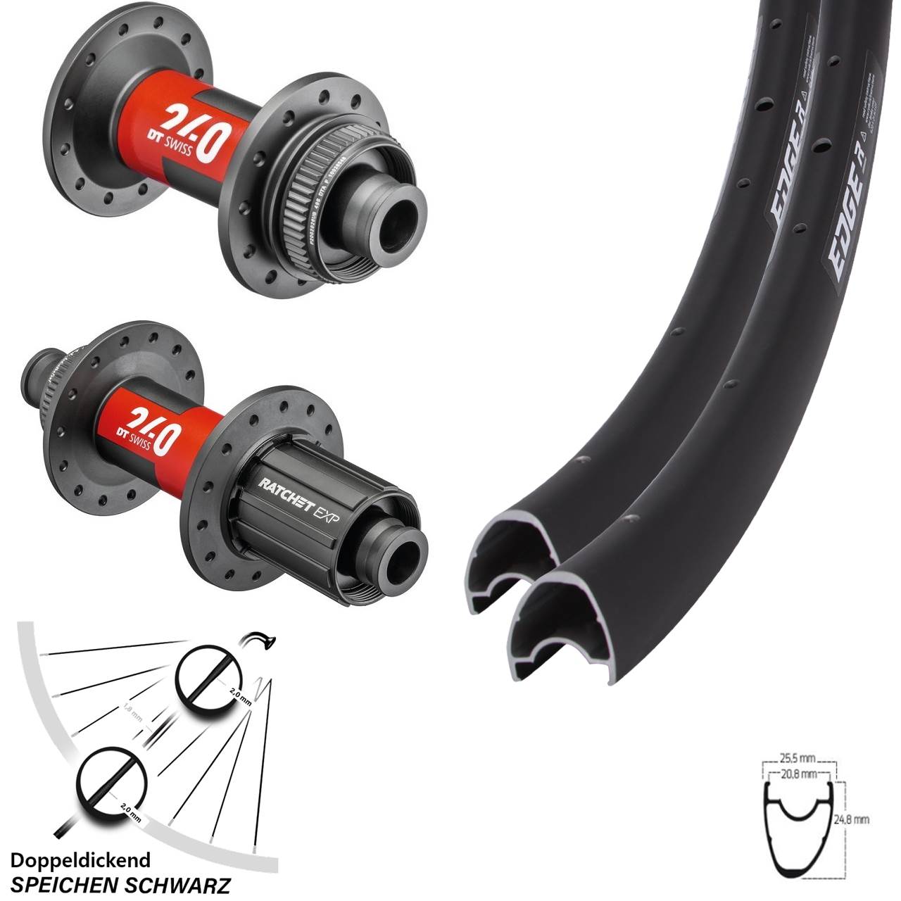 - 1 Hinterrad 12x142 28 Zoll Ryde Edge R25 Offset DT Swiss 240 EXP 8-12 fach (Auswahl zwischen Alunippel rot, Alunippel schwarz, Alunippel silbern, Messingnippel schwarz, Messingnippel silbern)