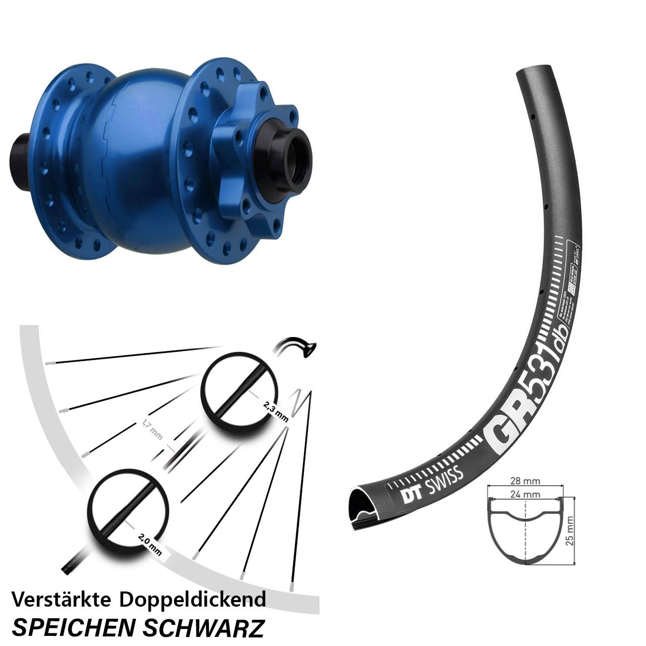 - Speichenstärke: 2,3-1,7-2,0 mm Edelstahl
