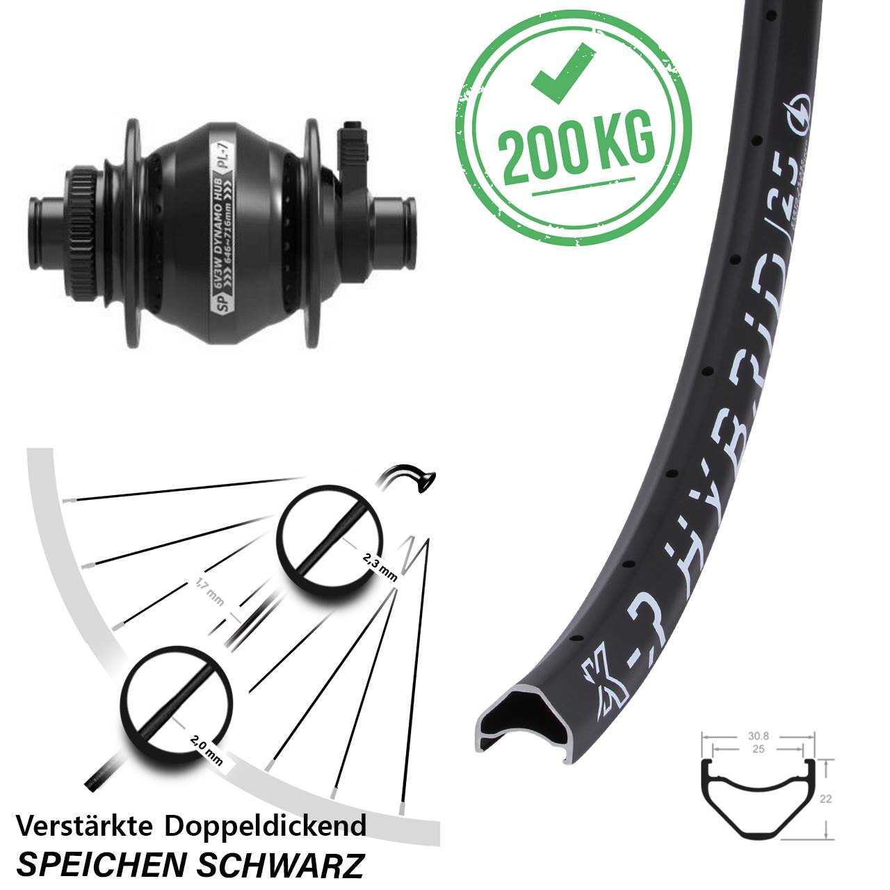 Technische Daten Vorderrad KX-R Hybrid 25 schwarz mit Nabedynamo Shutter Precision PL-7 Centerlock schwarz