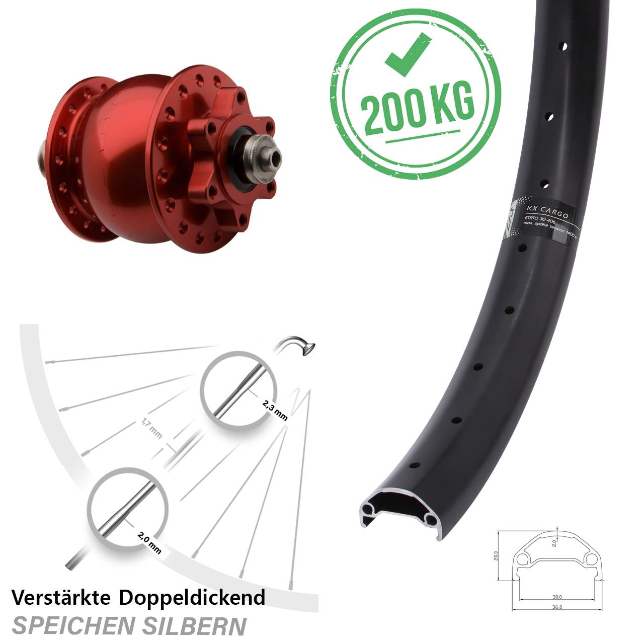 Produktbeschreibung Vorderrad 20 Zoll KX Cargo breite Felge Lastenrad Nabendynamo SON 28 rot 6-Loch