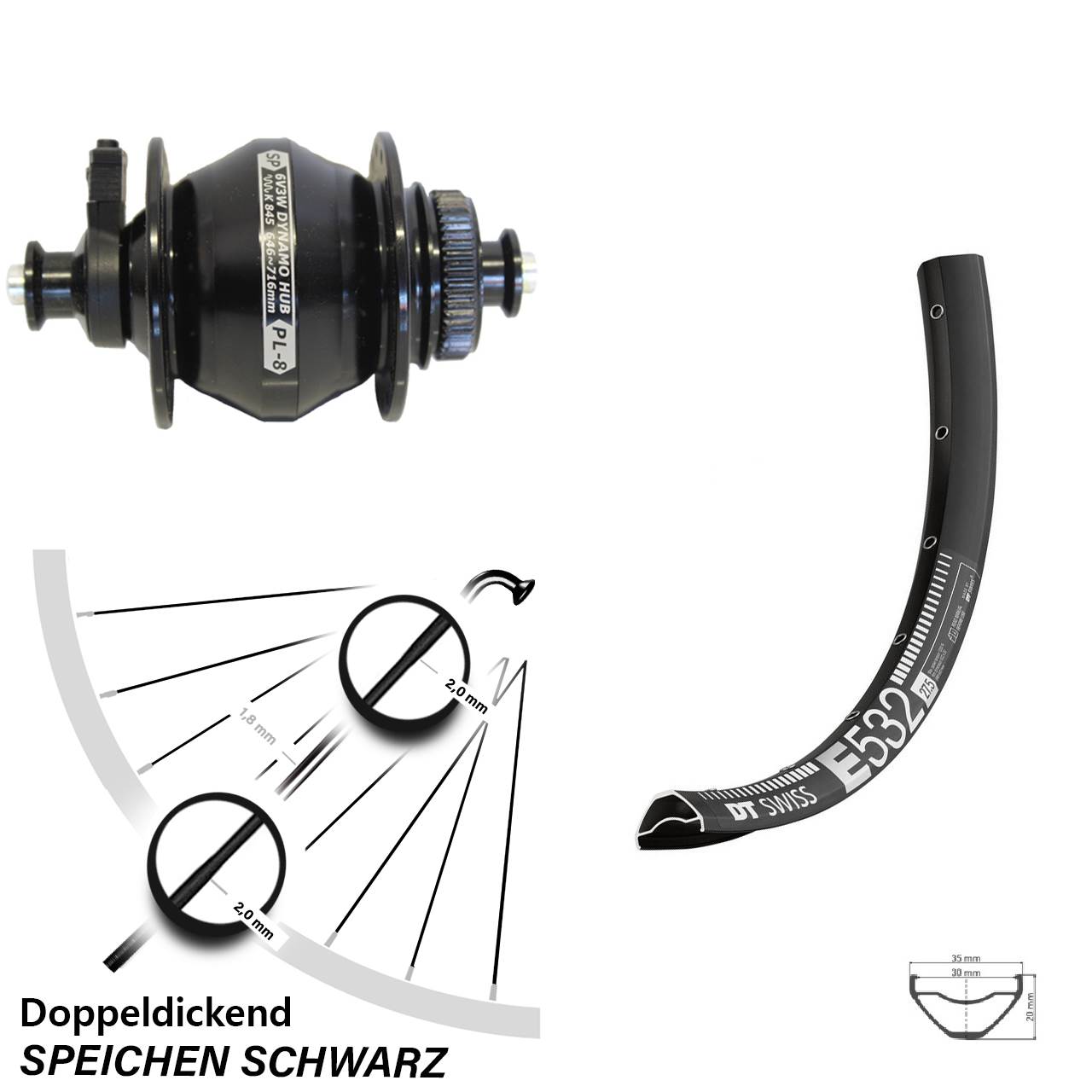Technische Daten Vorderrad DT Swiss E 532 Disc schwarz mit Nabedynamo Shutter Precision PL-8 schwarz