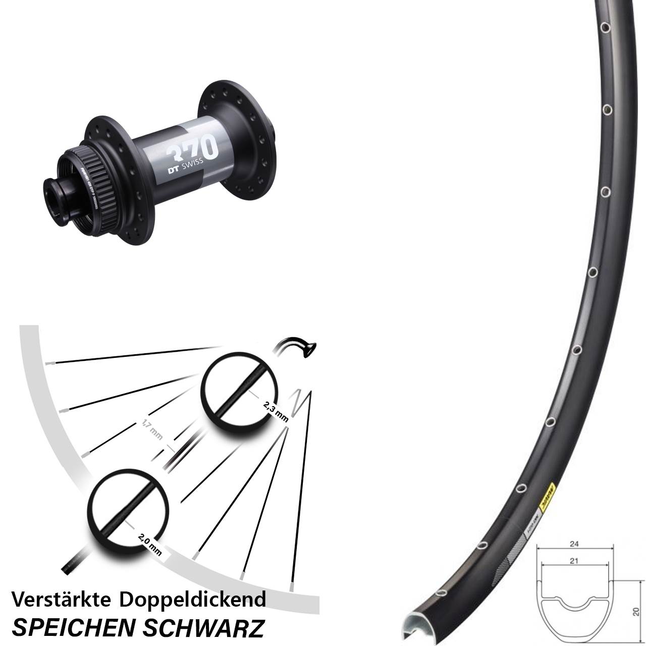 Technische Daten Vorderrad Mavic XC621 schwarz mit Nabe DT Swiss 370 Road schwarz