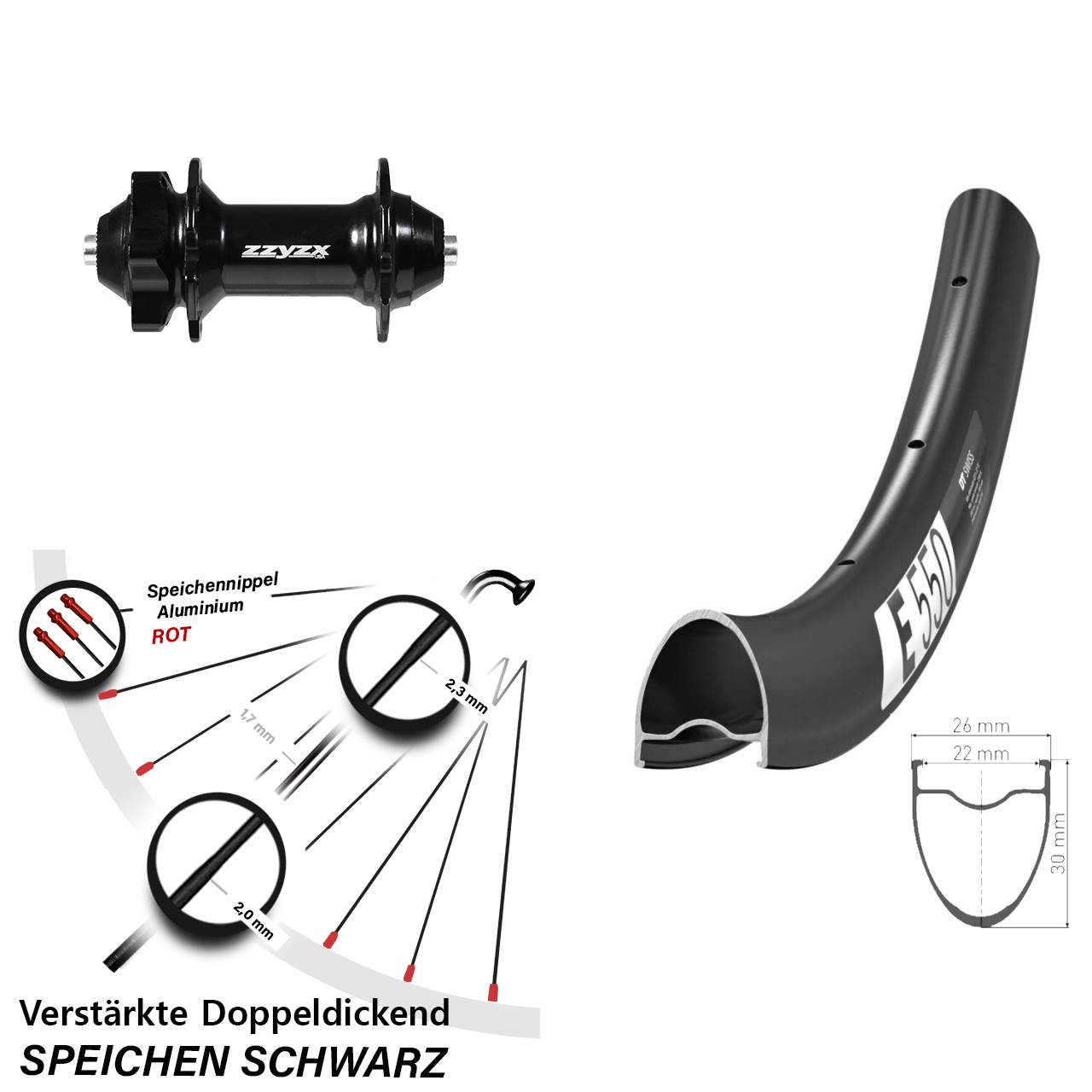 - Speichenstärke: 2,3-1,7-2,0 mm Edelstahl