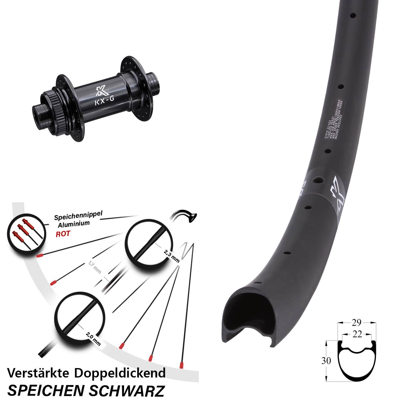 - Speichenstärke: 2,3-1,7-2,0 mm Edelstahl