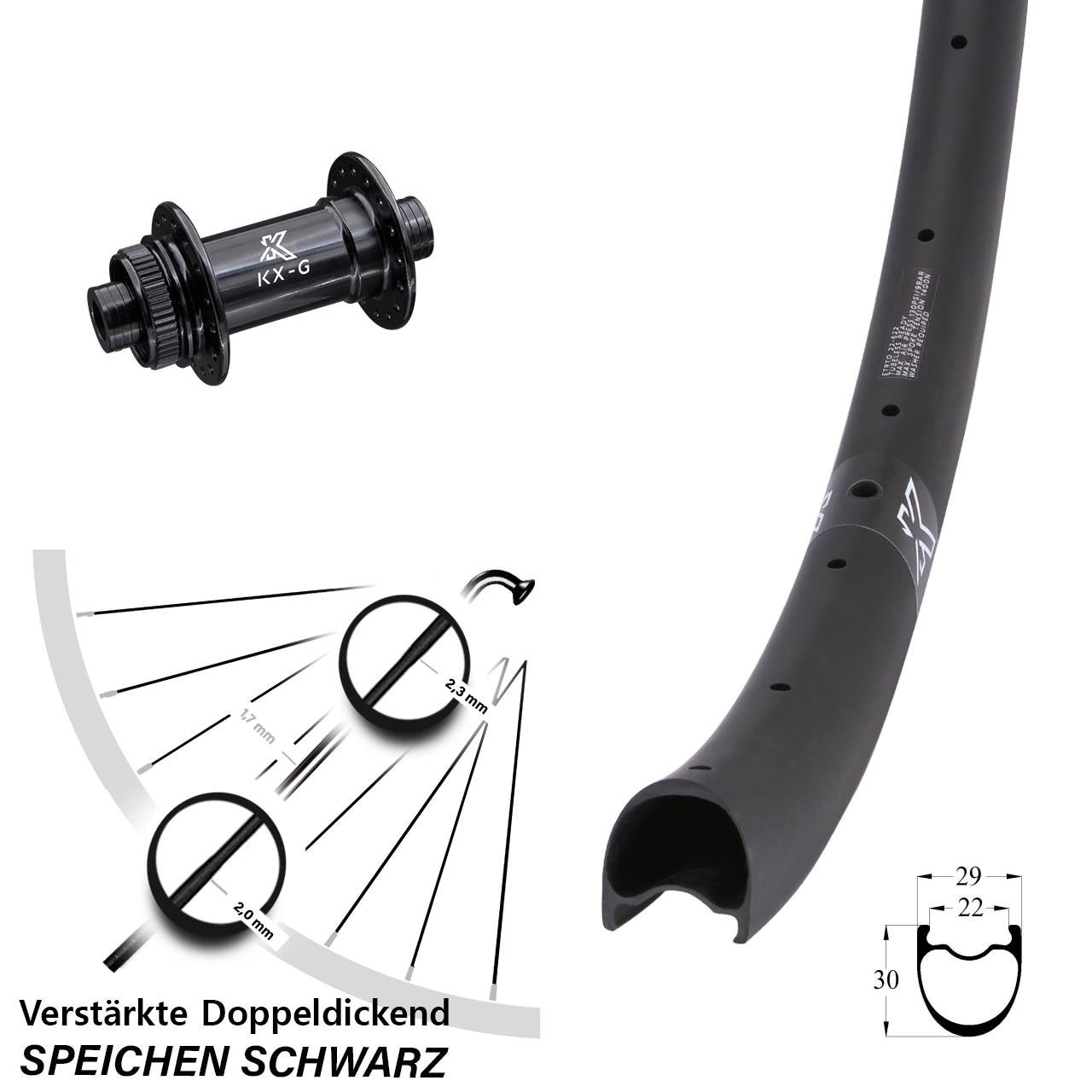 Technische Daten Vorderrad KX-RC Gravel Carbon schwarz mit Nabe KX-G Road schwarz