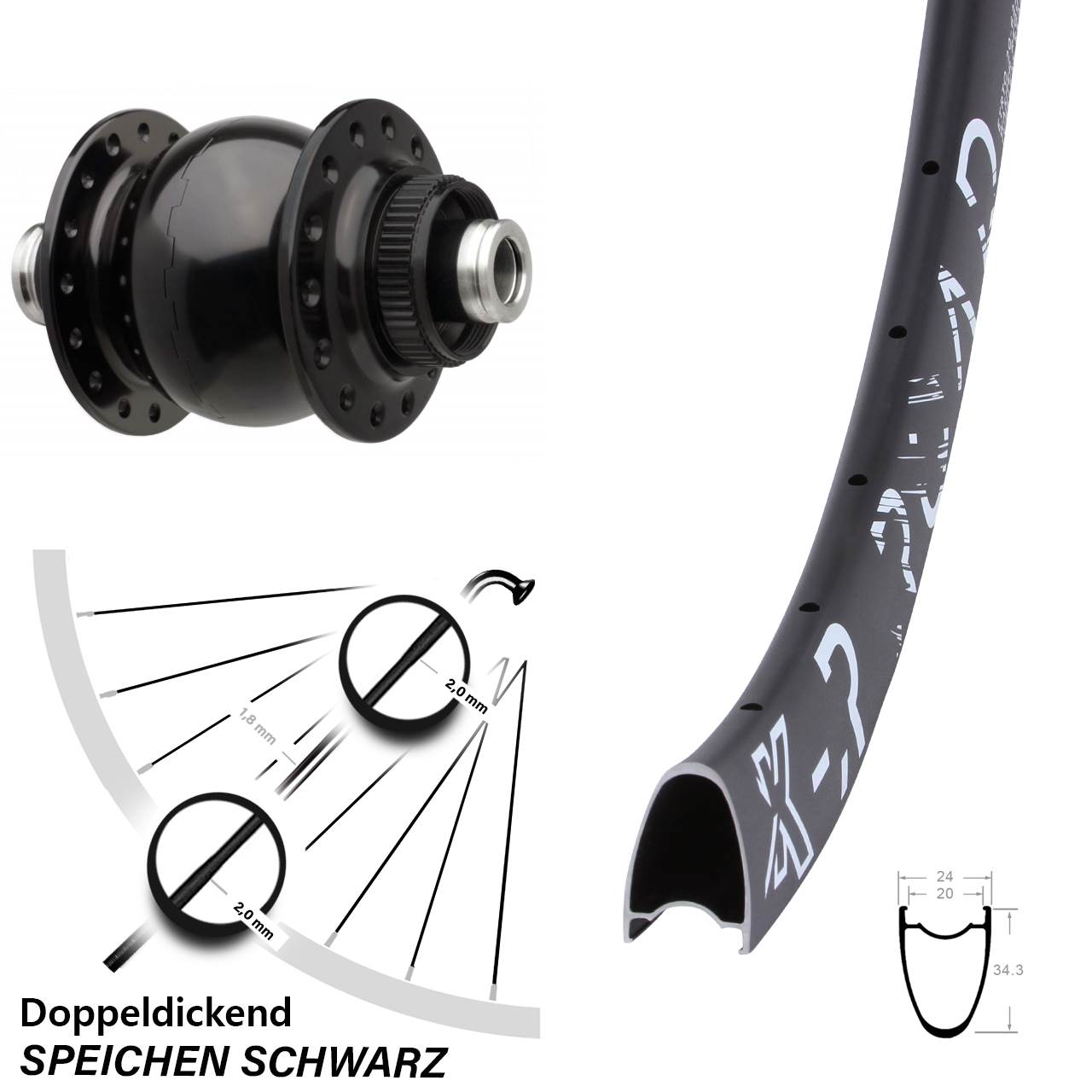 - Speichenstärke: 2,0-1,8-2,0 mm Edelstahl