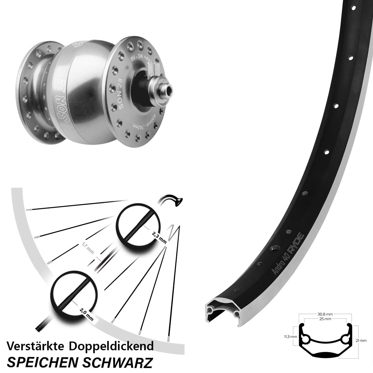 Technische Daten Vorderrad Ryde Andra 40 schwarz mit Nabendynamo SON 28 silbern