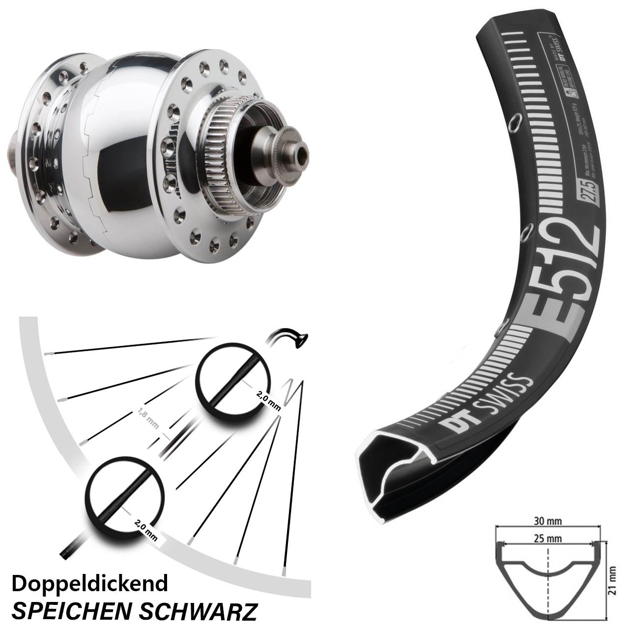 Technische Daten Vorderrad DT Swiss E 512 Disc schwarz mit Nabendynamo SON delux silbern