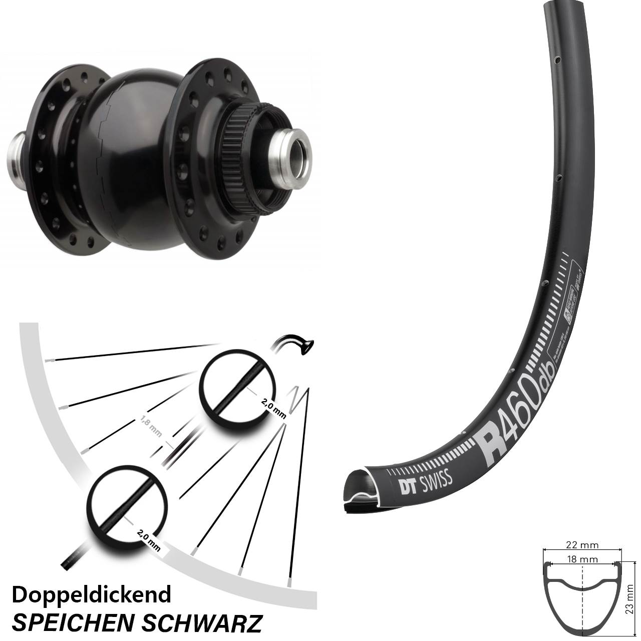 Technische Daten Vorderrad DT Swiss R 460 Disc schwarz mit Nabendynamo SON 28-12-110 schwarz